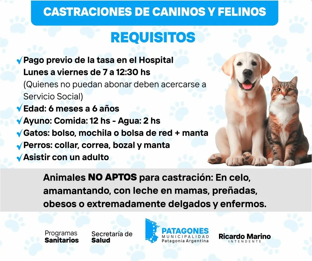 La Municipalidad de Carmen de Patagones, a través de Programas Sanitarios y la Secretaría de Salud, realizará nuevas jornadas de castración durante el mes de marzo, desde las 13 horas y por orden de llegada.